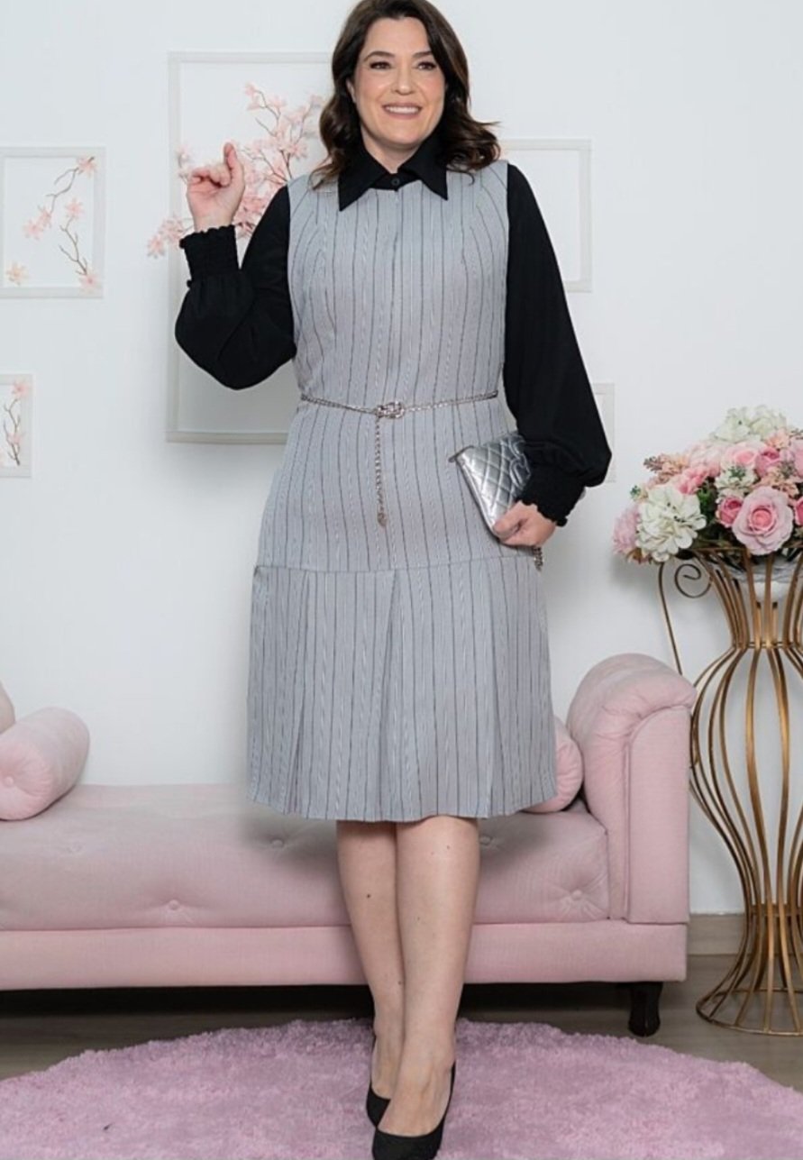 96% poliéster 04% elastano vestido cinza em alfaiataria risca de giz com pregase zíper frontal. acompanha o cinto.